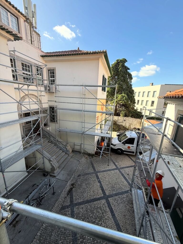 A recuperação de fachadas exige andaimes estáveis, seguros e adaptados à estrutura existente. No caso da sede do PSD, tratava-se de um edifício com uma morfologia complexa, o que implicou uma análise técnica detalhada e uma montagem totalmente ajustada às necessidades do projeto.